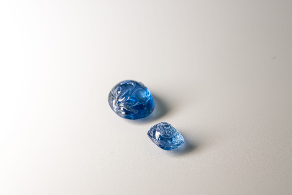 Each stone is first inspected for inclusions, with a design planned to highlight its shape while integrating natural flaws into the motif. The chosen design is carefully marked, and the stone secured for precision. Carving begins with defining the basic outline, followed by fine detailing to bring out smooth lines and intricate patterns. Inclusions are skillfully woven into the design, turning imperfections into features.