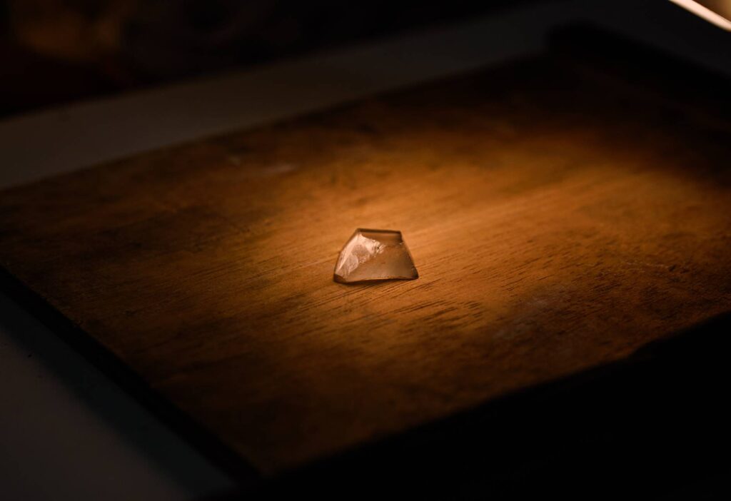 Once the processes are complete, the stone is smoothed with fine abrasives to remove rough edges and prepare the surface. It is then polished with diamond paste and specialized tools to achieve a high shine, even in the smallest details. A final inspection ensures every line is sharp, inclusions are seamlessly integrated, and the stone radiates flawless brilliance.