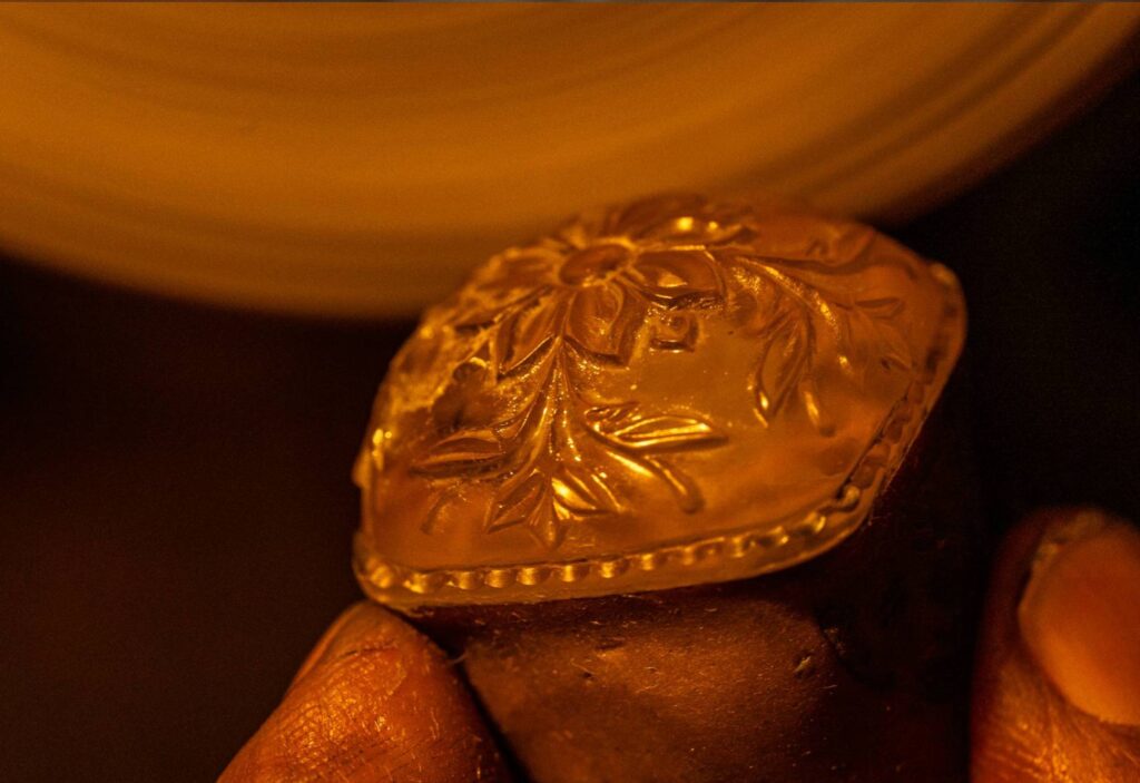 Intricate handwork transforms gemstones into unique artistic designs.